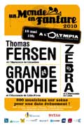 Un Monde en Fanfare réunit sur scène de nombreux musiciens émanant des harmonies de la région Nord-Pas de Calais dans un programme innovant et original. Avec la participation exceptionnelle de La Grande Sophie, DJ Zebra et Thomas Fersen.