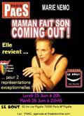 Ensuite, elle se balade un peu, vit à Londres, en Bretagne, en Italie, fait pleins de petits boulots, matière à écrire de nombreux textes et chansons. En 2000, elle revient à la scène avec « Maman fait son Coming-Out », comédie autobiographique et solo. (Plus de 200 représentations, à Paris, Lausanne, Metz, Festival d’Avignon 2005…)