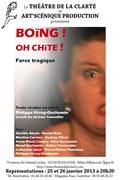 Boïng ! Oh chite ! est un moment de théâtre poétique qui retrace, à sa façon, la tragédie qui annonçait des lendemains sans et dont nous subissons les contrecoups. Sans aucune concession, cette farce témoigne du harcèlement médiatique de cet après-midi fatidique du 11 septembre 2001 pour un français face à la bête de l’apocalypse…