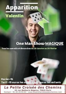Apparition est un one man show magique, un périple poétique, drôle et surprenant dans le monde de l’illusion. Valentin endossera les différents costumes du magicien : du dompteur de cartes au charmeur de pièces en passant par le manipulateur de rêves. Et seulement à quelques centimètres de vos yeux !