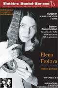 Née à Riga (Lettonie) en 1969, Elena Frolova commence à composer des chansons à l’âge de 12 ans. En 1984, elle monte sur scène et se fait rapidement remarquer. En 1988, elle obtient une distinction dans les catégories du Meilleur Interprète et du Meilleur Compositeur au Deuxième Festival de l’Union de la Chanson Barde à Tallinn.