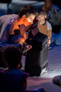 Des coussins cratères, une musique enveloppante, des mains magiques allumées, le ventre de l’accordéon, des planètes massantes, le sol moelleux dans lequel on s’enfonce, un écureuil malade, une lune volante, la respiration du public, des plumes de sang qui dansent. De 3 à 8 ans.