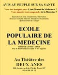 Jean Paul Escande n’aime rien tant que ces bains de public. Alors, sur la scène des Deux Anes d’abord, puis à la Gaieté Montparnasse, puis au Théâtre Mouffetard, il est venu raconter la médecine, le dopage, la peau, il est venu dire ou sont les Knock modernes. Et ça marche : le public aime ça, l’écouter parler de médecine en balançant de Molière à Pasteur, de Woody Allen à Marcel Aymé. Alors, toujours au boulot de bonne heure, sans abandonner ses recherches sur l’hôpital de demain, tout en travaillant plus encore à comprendre ce que sera la biologie du futur, le docte professeur a décidé de passer le turbo et de se lancer vraiment dans la relation médecine public en considérant que la voie de demain, ce n’est pas « tous malades » comme voulait Knock, mais… tous médecins !