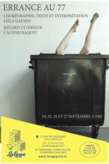 Errance au 77 s'écrit pour La Loge et s'y installe comme chez elle. On y découvrira une SDF interprétée par une jeune femme qui a grandi à deux pas de là. Le spectacle a la forme de son sujet : incorrigible.