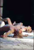 Velvet : ce quatuor féminin accompagné d’une DJ, se joue des codes de la cérémonie sado-maso, entre sérieux et mise en abyme, entre dérision appliquée et acceptation non moins sérieuse. Délit de fuite, duo d’hommes, partageant un moment de complicité, dans une atmosphère orientale, un hamman peut-être, où l’espace entre les deux corps se charge de tendresse, d’attirance.