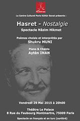 Un spectacle composé de vingt-trois poèmes de l'immense poète turc Nâzim Hikmet (sauf un poème chanté de Bedri Rahmi Eyuboglu), choisis minutieusement par Shukru Muni, accompagnés musicalement par la pianiste Aytèn Inan. En turc et français surtitré.
