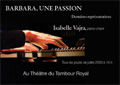 Ce spectacle inédit où chansons et ballets s’entremêlent est un cœur à cœur passionné dédié à Barbara. L’espérance, la tendresse et l’amour, mais aussi la mélancolie et la solitude, animent ce vibrant hommage à la “Dame en noir”.