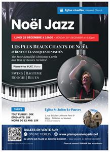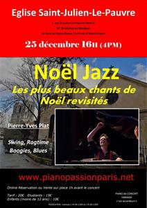 Les plus beaux chants de Noël, standards jazz et best of classiques revisités version ragtime, boogie, rumba, tango… Avec le pianiste Pierre-Yves Plat.