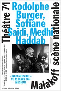 Voici le trio formé par Rodolphe Burger et sa guitare blues, Sofiane Saidi et son raï electro et Mehdi Haddab, surnommé le Hendrix du oud. Avec « Mademoiselle », ils nous embarquent à l’endroit où le Mississippi se jette dans la méditerranée pour un concert hommage à Rachid Taha.