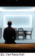 Ils sont deux. Ils sont chez eux. Ils sont de l'autre côté de la rue, du plateau. Nous sommes dans la position exacte du quatrième mur. Ils se regardent. Nous sommes chez eux mais nous sommes loin. L'un est assis, nous voyons son visage. L'autre est debout de trois-quarts dos. Ils vont parler ou se sont parlés. Si l'on prend le temps de regarder plus longuement, il se passe quelque chose qui attire l'attention d'une manière presque détournée. Qu'est-ce qu'ils regardent ? Se regardent-ils vraiment ? Ils sont pourtant dans la même pièce.