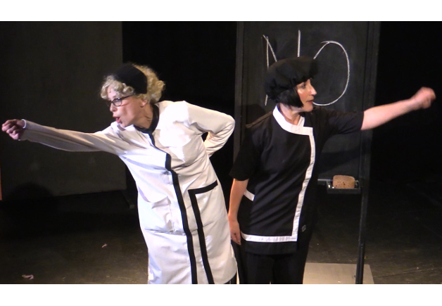 Cela a permis la création de deux espaces scéniques radicalement différents et complémentaires : Un espace quasi scolaire, dénudé, lumière crue et blouses blanches, donnant naissance à un duo désopilant dominant/dominé travaillé à la manière des grands duos comiques (Laurel et Hardy notamment). Un espace Cabaret organisé autour d’un pianosalon, objet construit pour la circonstance, créant une intimité chatoyante et un brin sulfureuse, où s’ébattent deux artistes accomplies et complices.