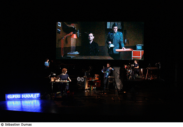 Comme un film d’espionnage, la tragédie de Shakespeare est ici condensée, actualisée et pastichée. Sur scène, les artistes jouent de la musique, doublent les dialogues et bruitent malicieusement les scènes de ce (super) Hamlet.
