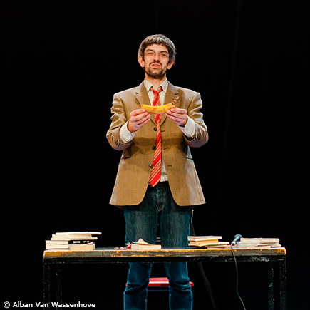 Cravate et veste un peu courte, vite débraillé, il se raconte. Fabrice, sale gosse du village, est un voyou à la fumette facile. On le fout dehors, on lui balance des pierres. Cinq ans plus tard, il revient. Un 14 juillet. Il a joué au cinéma dans Eldorado de Bouli Lanners et avec DiCaprio dans The Revenant. Justement, il revient. On lui balance des fleurs, on s’agenouille devant l’enfant prodige. Sur scène, Fabrice devient Jacky. Il joue de son autobiographie, parcours à virages et à tumultes. Il parle de sa mère, de la drogue, de la colère, des auteurs qui le hantent. Il bégaie quand il évoque la prise de parole en public. C’est l’échec d’être au présent qui l’intéresse. Il en fait un art brûlant de l’acteur, qui se consume dans le rire des autres, hilarant petit prince grand format d’une planète d’ici et d’aujourd’hui.