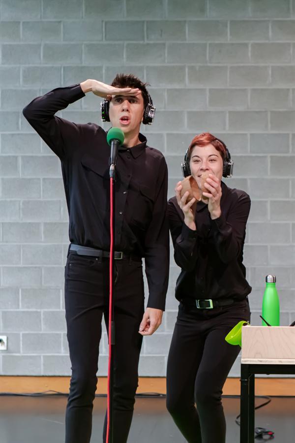Face aux jeunes spectateur·rice·s se tiennent un comédien et une bruitiste. Sur leur table, des micros, une bouteille d’eau, quelques ustensiles de cuisine ou encore deux noix de coco, il ne leur en faut pas plus pour fabriquer, à vue, un petit théâtre de l'écoute. Un espace où l’art de la suggestion est roi et les idées si larges qu'elles n’ont ni envers ni endroit.