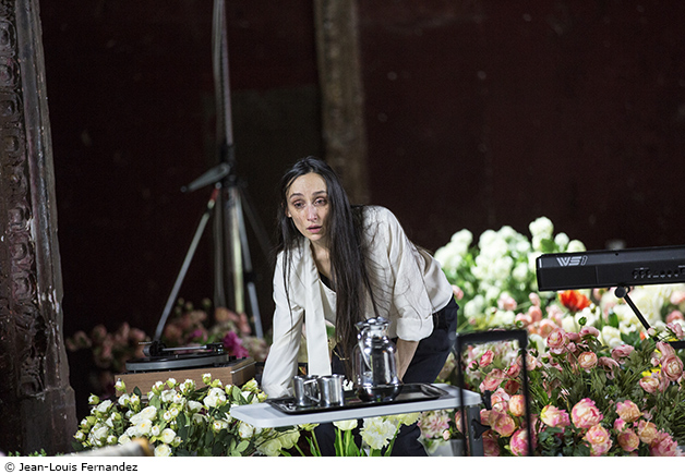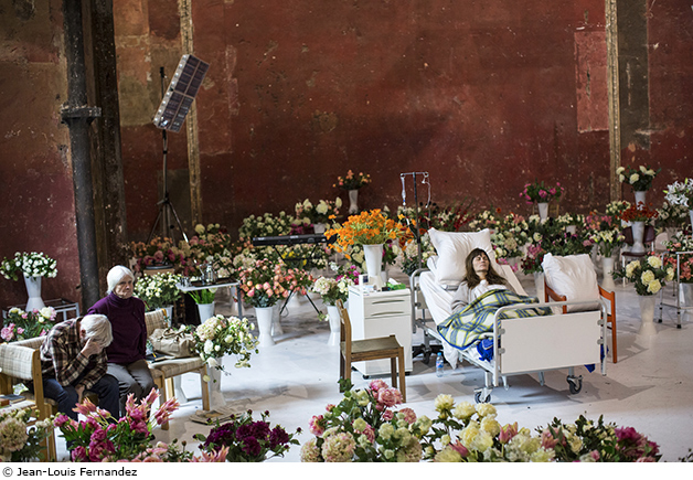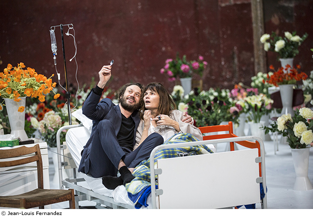 Ça se passe dans une vraie chambre, blanche, sous des lumières de néon. Il y a un lit, une table, un piano. C’est une grande chambre d’actrice qui travaille bien et qui a les moyens de vivre confortablement. En même temps, il y a entre cent et deux-cent-cinquante bouquets de fleurs de ses admirateurs. Donc on est à la fois dans l’espace réel et en même temps dans une sorte d’installation extrêmement colorée avec toutes ces fleurs qu’on lui a apportées et qu’on continue de lui apporter pendant toute la pièce. Chacun arrive avec des bouquets et des fleurs et il y a ce côté un peu Dame aux camélias. C’est beaucoup dit dans le texte : il faut ouvrir les fenêtres, les fleurs la tuent, etc. On est entre une sorte de sublime magasin de fleurs et en même temps un reposoir. Elle est déjà à l’intérieur d’un reposoir.