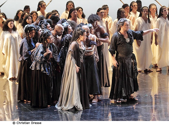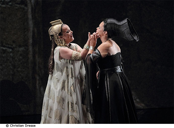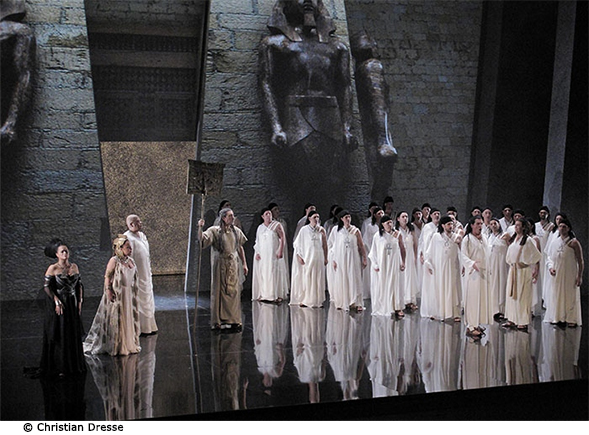 Vous assisterez à une vision scénique flamboyante et poétique, qui rend grâce à l’incommensurable beauté de la partition grâce à des projections en 3 dimensions. Conçus à l’origine pour les Chorégies d’Orange, mise en scène, décors et projections vidéo sont ici adaptés avec soin pour la scène de l’Opéra de Massy. On retrouve les éléments qui évoquent l’architecture monumentale et les symboles de l’Egypte ancienne. Après Il Trovatore et La Cenerentola, Charles Roubaud nous offre de nouveau une production sobre et soignée avec des artistes de grande qualité notamment Cécile Perrin, divine Tosca en 2009, ou Sylvie Brunet-Grupposo qui avait triomphé à Massy dans Dialogues des Carmélites en 2012.