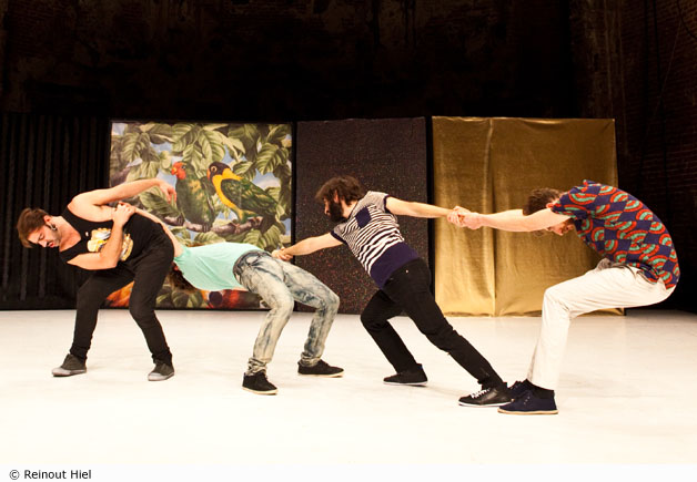 Poursuivant l’interrogation sur ces affaires d’hommes, ce travail en quatuor pousse le bouchon encore un peu plus loin. Selon la célèbre phrase de Brassens, « Dès qu’on est plus de quatre, on est une bande de cons »… Oui, mais, que faire à quatre, sinon les cons ? Sortir des paillettes et des ballons, des objets détournés et d’autres retournés, une batterie pour taper dessus… Et, si ça ne suffit plus, on peut se monter dessus et se descendre, se mesurer, se cacher, se courir après, s’épater, se faire des sales blagues et quelques gentillesses. Il était déjà bien difficile d’exister tout seul. À deux, c’est pas gagné, à trois, ça se complique, alors à quatre, excusez du peu…