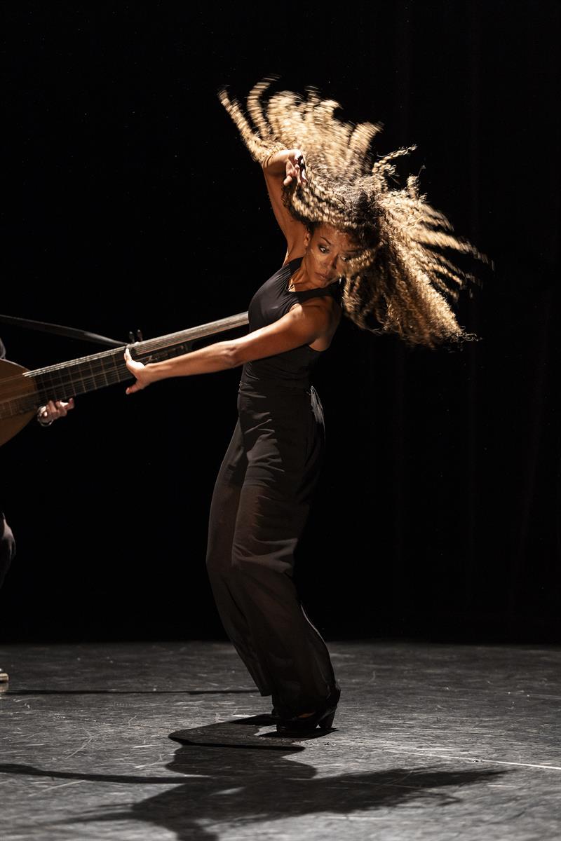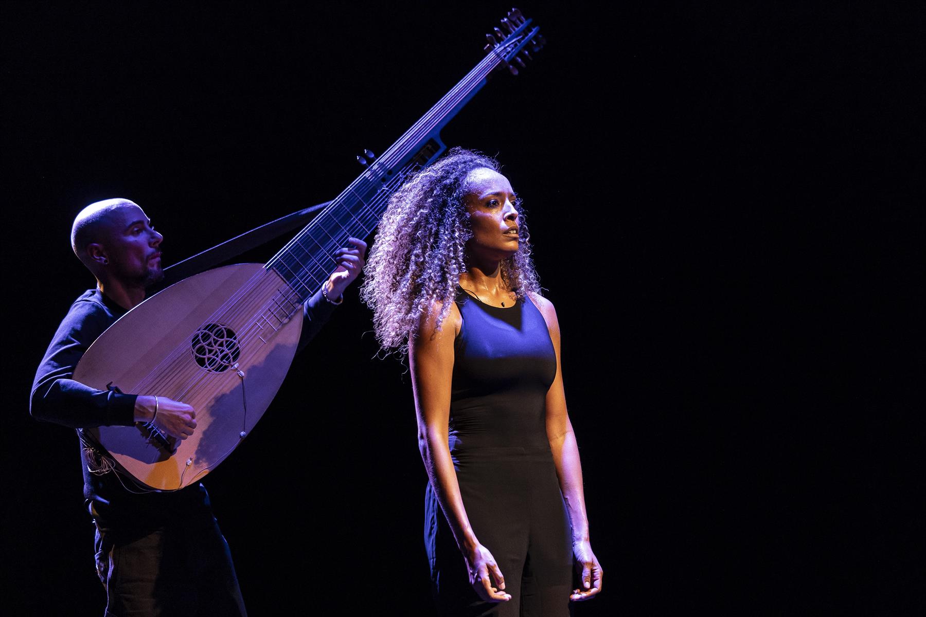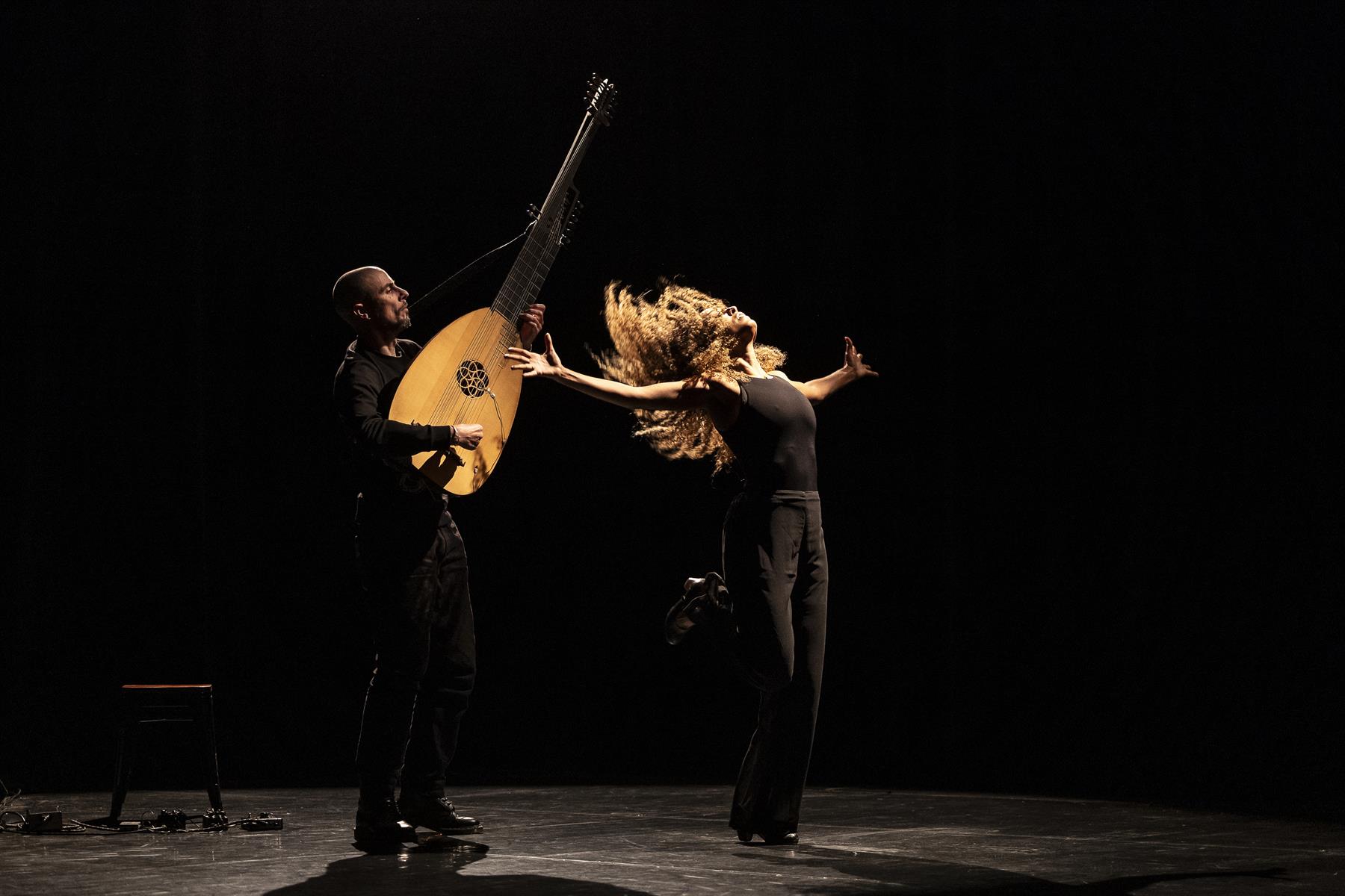 Dans sa douleur et sa délicatesse, elle est suivie par le virtuose José Sanchez qui berce son énorme théorbe au gré des mélodies baroques. Ombre fidèle et poétique, il crée un jeu de miroirs, telle une osmose entre le corps d’Ana Pérez et le majestueux luth à double manches.