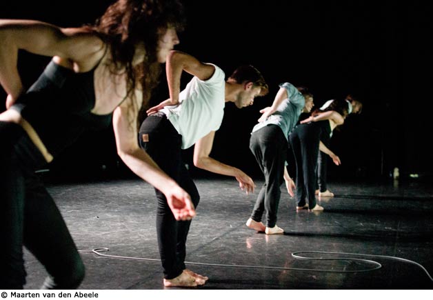 Dans le noir, des rires et des pas. Puis on distingue un corps qui se promène et éclaire la scène à la lampe de poche : c'est celui de la chorégraphe Ann Van den Broek elle-même. Surgit un homme qui rit adossé au mur du fond, un autre, ailleurs, qui déchire des choses au sol. Les images s'évanouissent aussitôt. D'autres apparaissent sur un écran cette fois : une chaussure, une chaise, des pieds juchés sur des talons hauts qui cherchent à s'échapper. Le dispositif est posé. Le plateau sera la plupart du temps plongé dans l'obscurité, éclairé sporadiquement par le faisceau d'une lampe, et des images vidéo, filmées live ou non, apparaîtront au fond.