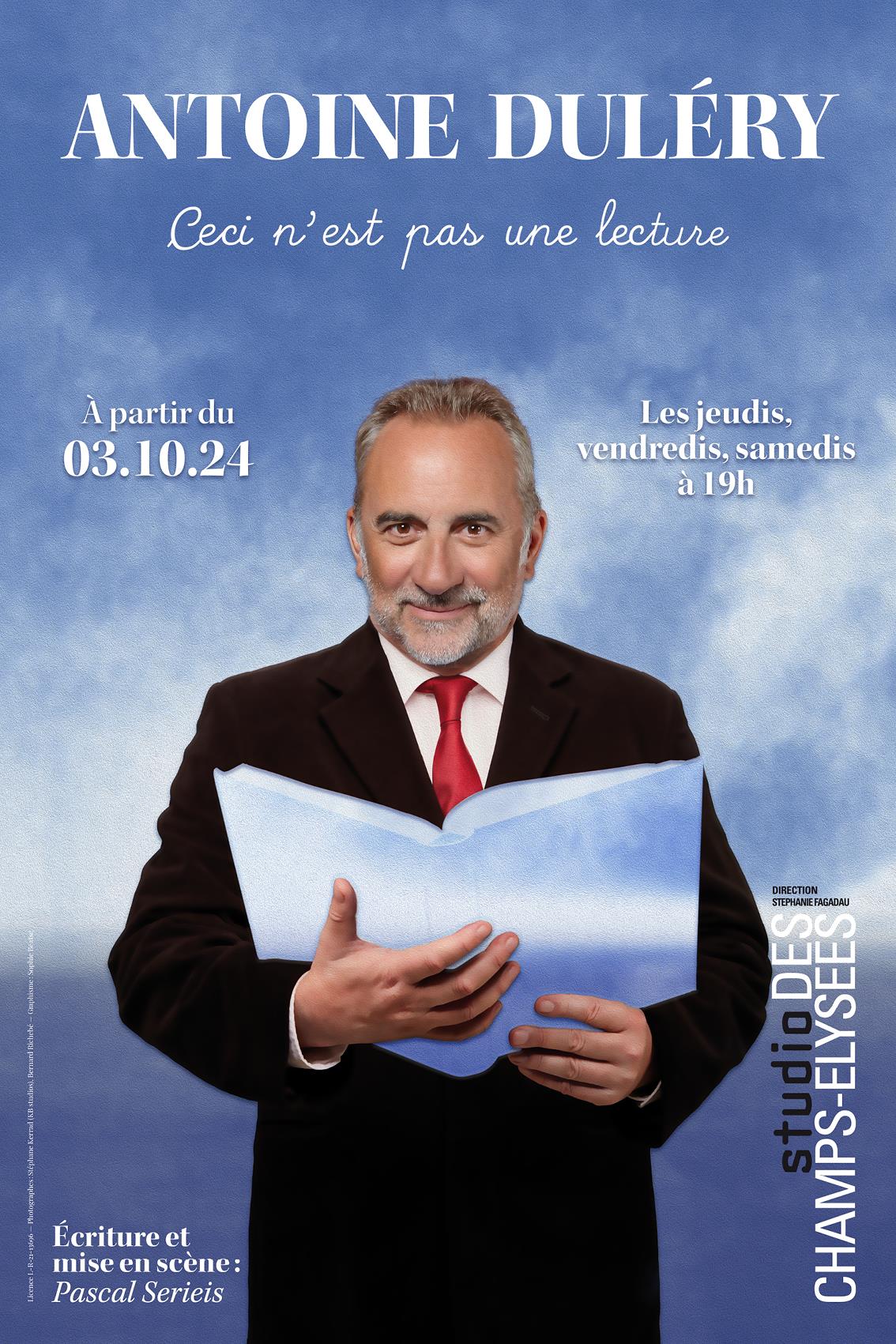 Dans son nouveau spectacle, Antoine Duléry nous entraîne dans une expérience littéraire inédite… il ne fait pas une lecture, il fait bien plus ! Antoine nous raconte la « lecture », sa découverte, son apprentissage, et tous ces moments de joie et de fantaisie qu’il a partagés avec elle.