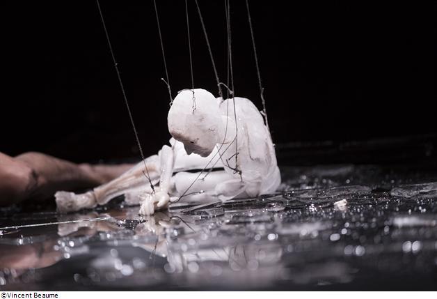 Abandonné à son destin, Oedipe est un être fragile représenté par une marionnette de glace animée par de longs fils. À deux, dans le cercle de l’errance, ils se glissent entre ombre et lumière, glace et feu et se transforment.