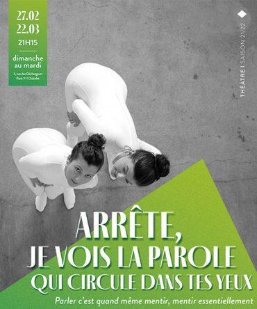 Arrête, je vois la parole qui circule dans tes yeux est une folle traversée du langage. Sur le plateau, deux comédiennes en perpétuelle transformation du corps et de la voix entrainent les spectateurs dans un flux continu de postures, de situations, de mots types, de personnages-types, autant d’excursions imaginatives, saisies au vol. Un voyage ludique et plastique au cœur de la parole : nous sommes humains, notre richesse est dans notre capacité à parler, à échanger. Qu’en faisons-nous ?