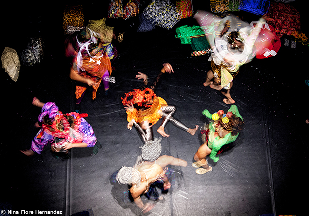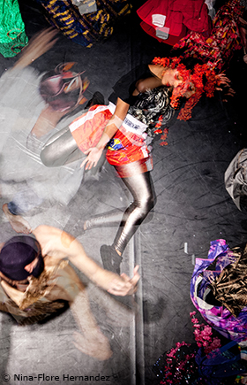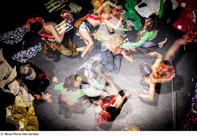 Dès l’ouverture des portes, les spectateurs sont accueillis dans l’atmosphère d’un zénith carnavalesque et tonitruant. Sur scène, on se grime, on fabrique des costumes à coups de ciseaux, on bouge, on parle, on interagit avec la salle. Puis, l’excitation viscérale se transforme, et la danse prend l’allure d’un rituel ancestral, primordial. Issu d’un long processus de création collective, Ballroom est un incroyable espace participatif de liberté, corporelle et psychique. Une utopie partagée.
