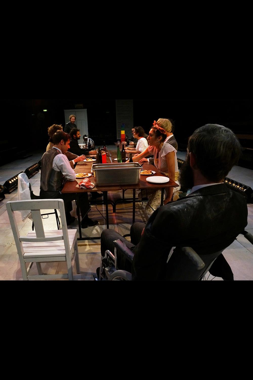 Comme il l’avait fait précédemment sur un autre sujet politique-le fascisme –, avec Edelweiss France fascisme, Sylvain Creuzevault m’a, avec son Banquet Capital, intéressé sans toutefois parvenir à me délivrer un message clair. Il nous donne envie d’en apprendre plus sur la révolution de 1848, sur les désaccords au sein de la gauche à cette époque, sur le procès de Bourges, mais aussi sur la théorie économique de Marx, sans parvenir à être vraiment didactique, brassant nombre différents sujets sans établir vraiment de lien clair entre eux. Par ailleurs, le dispositif bi frontal, s’il est adapté à une scène de banquet, rend difficile la clarté du propos des comédiens lors des scènes de dispute. Alors, on ne s’ennuie pas, mais on repart de ce banquet avec un sentiment de confusion qui domine. PS : ajoutons – je ne sais si c’est le cas ailleurs qu’à Malakoff – que le dispositif bi-frontal a été réalisé avec des gradins réellement très inconfortables, ce qui n’aide pas le public à se sentir à l’aise et attentif.