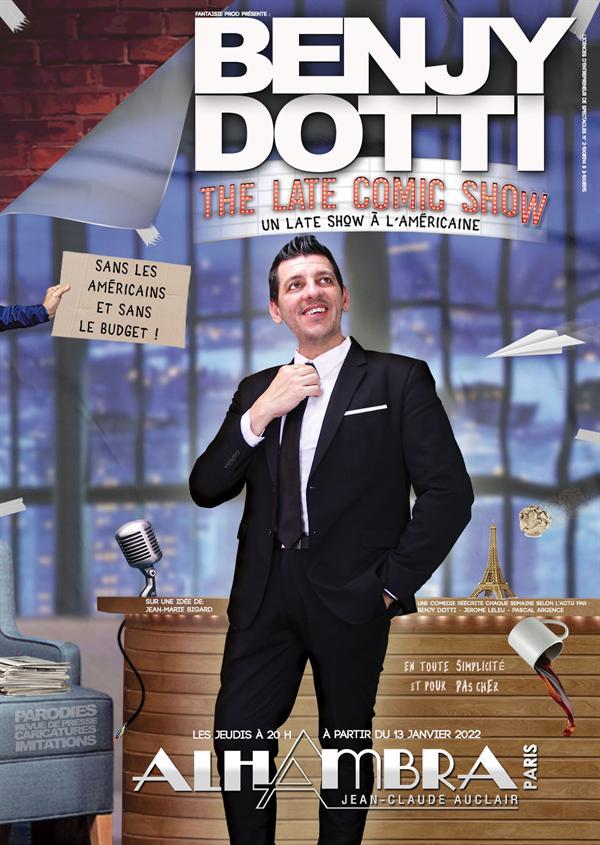 Benjy Dotti caricature à la manière d'un late show à l'américaine, l'actu, les Peoples, les politiques... Performance live, grands moments de Music-Hall, détournements vidéo au programme de cet artiste et tout ceci "En toute simplicité et avec quelques accessoires"