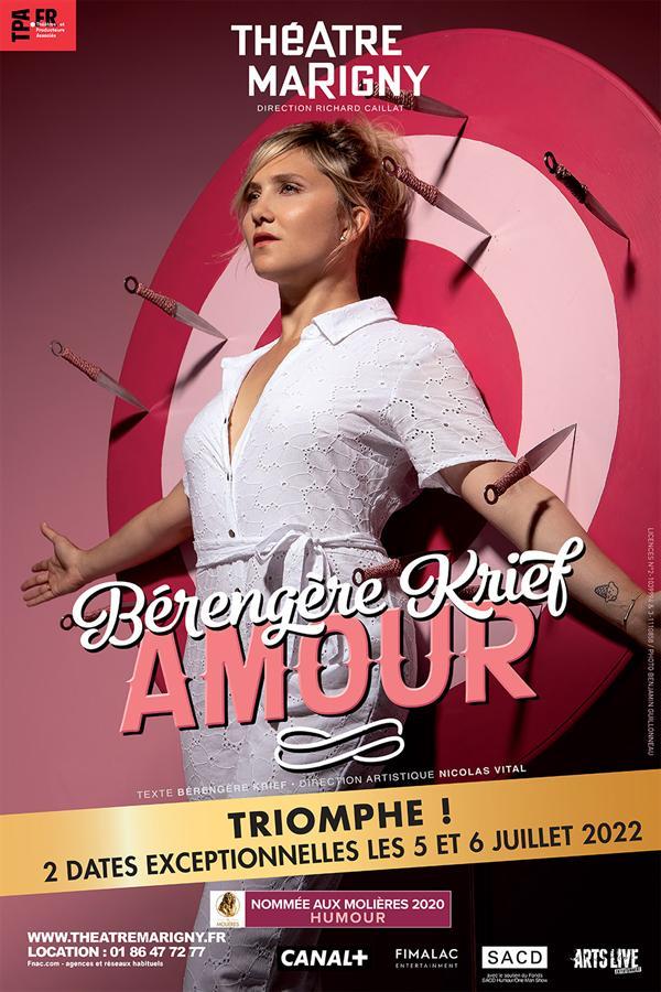 Pantalon à paillettes ou short en strass, Bérengère Krief joue les équilibristes empêtrées dans les nœuds sentimentaux. Juchée sur un cerceau, hissée au-dessus d’une piste de cirque, la comédienne retrouve la scène après trois ans d’absence. Elle vient dresser un bilan caustique de sa vie d’aventures, idylles et ratages du cœur, ses quelques dernières années passées en exploratrice d’expériences. Joies et déboires en vrac d’amourettes en toc ou d’histoires d’amour vraies, elle raconte, piquante, hilarante ou grave, le bonheur inévitable d’aimer, sans esquiver l’inévi-table sujet des violences faites aux femmes. Un stage de développement personnel en Ardèche, un roadtrip en solitaire, un mariage annulé et des espoirs nouveaux, les savoureux détails de sa dernière rupture... Bérengère croise les chansons de Nicole Croisille et d’Aya Nakamura. Elle brasse, en femme libre, drôle et poignante, tous les ridicules et toutes les surprises, bonnes ou redoutées, de l’amour.
