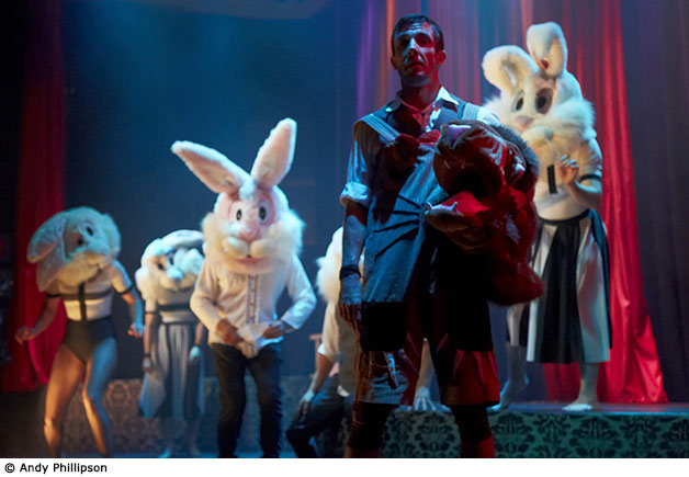 Ça, c’est bien un titre anglais de cirque australien : Beyond pour au-delà, par-delà les frontières et les limites, aux lisières de tout ce qui rapproche l’homme de la bête. L’instinct, le désir, l’impulsivité. Beyond the beast, les casse-cous apparaissent avec une tête gigantesque de lapin. Les bestioles s’agitent, virtuoses de l’envol et de la chute.