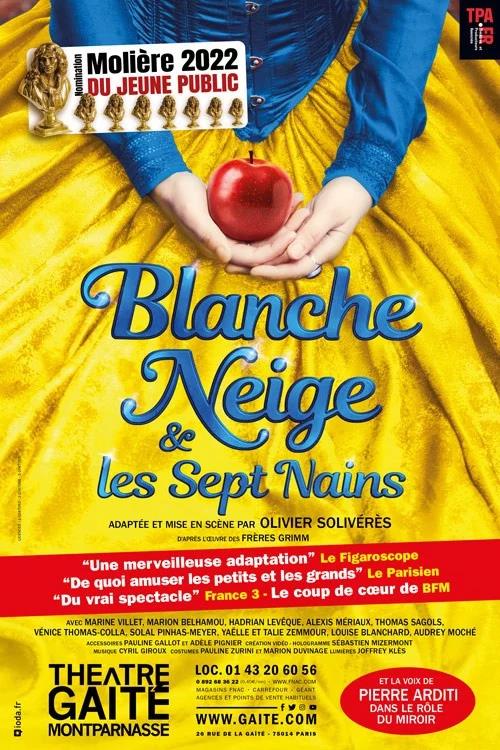 Un très bon spectacle qui ravira les enfants et les parents: on retrouve toute l'histoire de Blanche Neige, mais avec beaucoup d'humour et quelques références et jeux de mots que seuls les parents comprendront. Les costumes sont très beaux, la mise en scène très réussie avec les décors projetés et les hologrammes. Mention spéciale à la Reine/Sorcière, excellemment drôle ! Mes enfants de 5 et 8 ans ont beaucoup aimé.