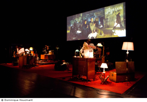 À partir de 1 400 extraits de films américains, les membres du collectif ont créé un véritable film de montage, doublé et bruité en direct par les comédiens et accompagné d’une bande-son jouée en live. Le résultat ? Un thriller social où les figures cultes du cinéma américain deviennent les héros involontaires d’une lutte ouvrière contre un pouvoir cynique et corrompu.