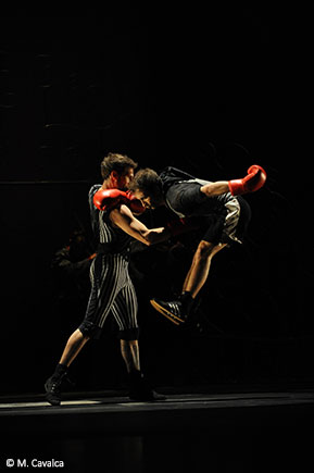 Huit corps en transe entre deux lourds sacs de frappe. Ils se désapent, finissent en justaucorps, shorts longs. Les corps s’agitent le temps d’avant l’attaque, l’excitation qui précède la bataille. Mais on lance les sacs, on les fait se balancer au-dessus de la scène, et ce sont eux qui viennent cogner les danseurs. Hip-hop, élans sensuels, gestes énergiques, Boxe Boxe dessine des parallèles entre deux arts majeurs. Sur le ring de boxe ou le tapis de danse, l’artiste sue, se bat, s’expose au regard du public, des critiques, de l’arbitre. Il combat ses limites et son adversaire. Solos, duos, mouvements collectifs, Boxe Boxe invite Mohamed Ali et ses sauts dansés. La pièce convoque les fantômes de Laurel et Hardy dans la fantaisie burlesque d’une boxe des débuts, drôle de lutte.