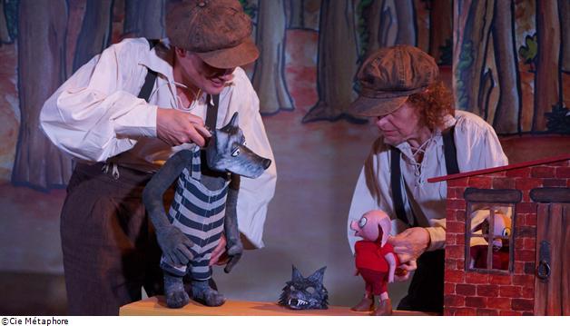 Dans un décor de forêt, les trois petits cochons jouent au loup sur l’air de « Promenons-nous dans les bois ». Ils sont joyeux jusqu’à ce que le vrai loup apparaisse. Un spectacle plein d’humour sur la peur du loup où se mêlent marionnettes et comptines traditionnelles. À partir de 5 ans.