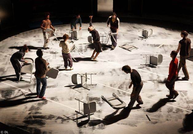 J’ai aussi certaines « obsessions » . Quelques figures propres aux Hommes penchés, s’intègrent petit à petit au processus de travail : les anonymes, les aveugles, l’ordinaire avec la chaise, la perte des repères habituels….. On cherche à déplacer l’ordinaire. Ce choix scénographique radical, qui se limite aux agrès et à la matière brute ouvragée comme un espace dynamique et abstrait contribue à créer un autre rapport à la hauteur, à l’air, à la circulation des interprètes dans l’espace… C’est la première fois que, dans un de mes spectacles, je ne serai pas sur le plateau comme interprète… mon rôle est de faire apparaitre toutes les personnalités engagées dans cette création.