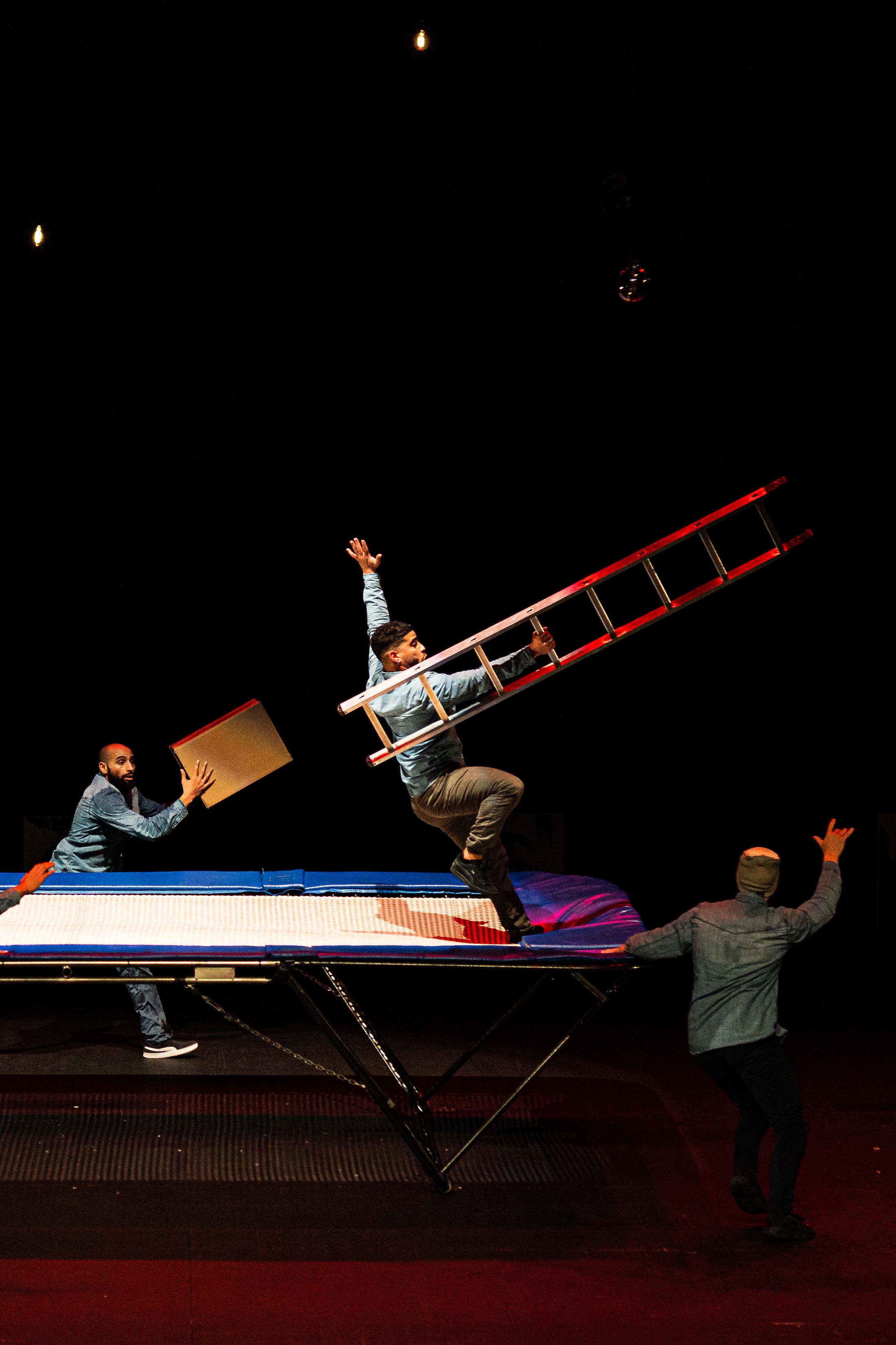 Autour du trampoline, le temps se suspend, les artistes s’affranchissent de la gravité avec légèreté, entre chutes maitrisées et envols gracieux.