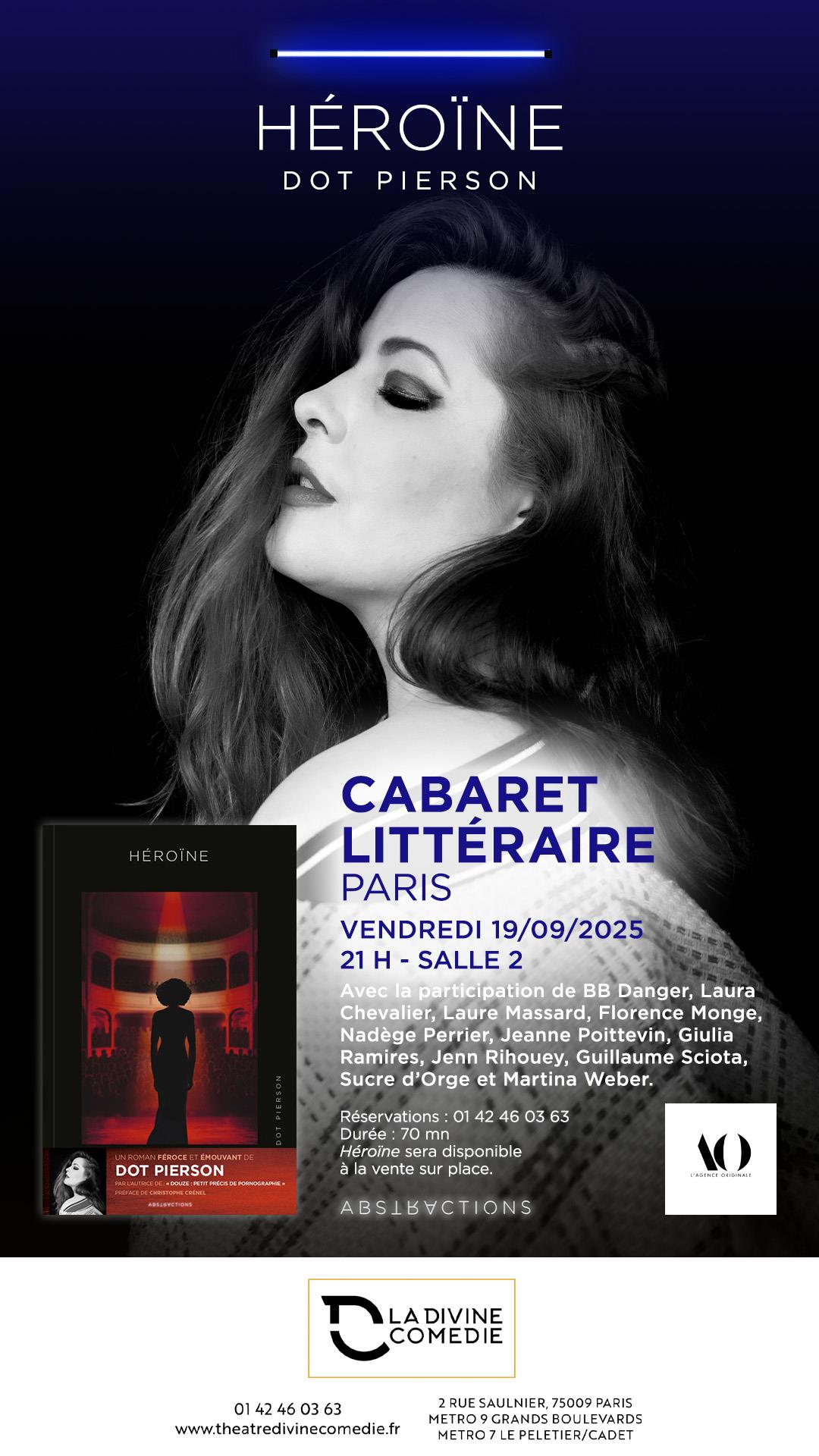 À l’occasion de la sortie du roman Héroïne de Dot Pierson, à paraître le 12 septembre 2025 aux éditions Abstractions, un cabaret littéraire prend vie — entre lectures brûlantes, danse, burlesque, chansons et rituels de scène.