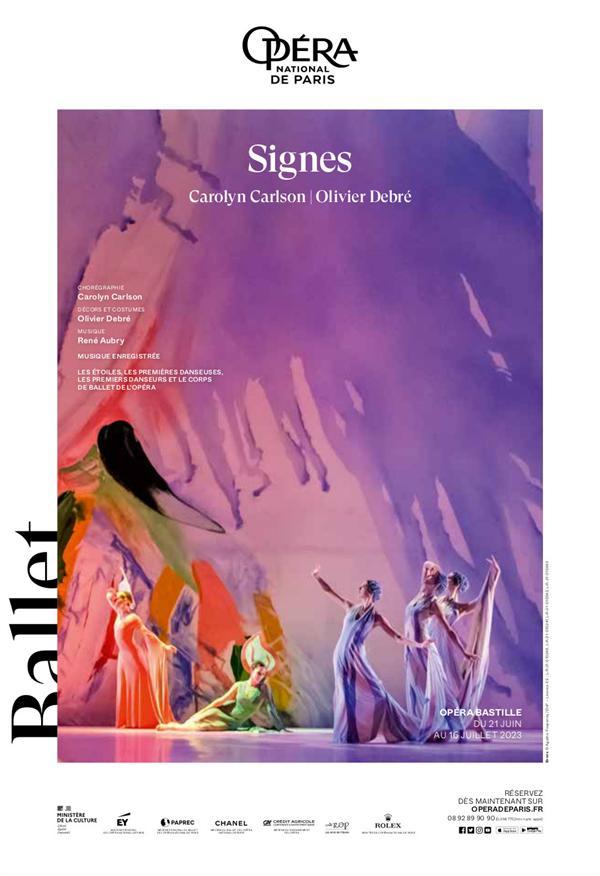 Cette oeuvre est partie d’une volonté du peintre Olivier Debré de traduire en une série de tableaux les évocations que lui inspire le sourire, premier d’entre les « signes ». À partir de ces flamboyants paysages peints, représentant différents lieux du monde comme autant de sensibilités et d’humeurs, la chorégraphe Carolyn Carlson met en mouvement les danseurs sur une partition originale de René Aubry, donnant vie à une oeuvre onirique. Ballet désormais culte du répertoire de l’Opéra, Signes s’impose comme la signature du rapprochement entre peinture, musique et danse qui se répondent et se prolongent mutuellement sur scène.