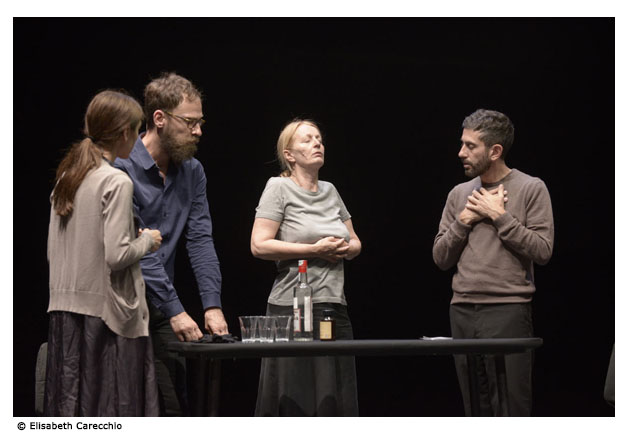 En scène avec nous, – pour la première fois depuis le début de notre travail ensemble – nous avons Monica Piseddu et Valentino Villa. Ils sont là non seulement dans un souci de cohérence avec le nombre des protagonistes, mais aussi pour souligner la présence de cette petite collectivité, nécessaire et importante, un élément essentiel dans cette image, qui n’est simple qu’en apparence.