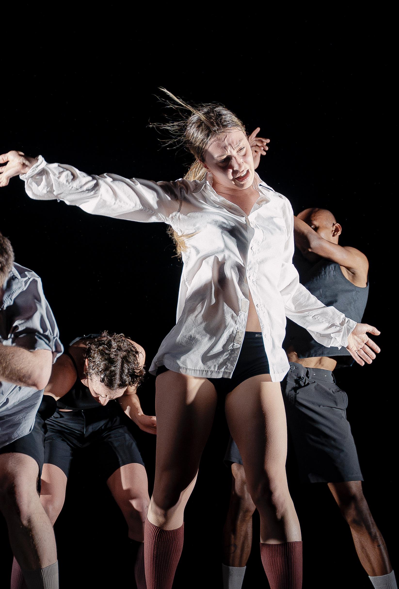 À l’heure des prouesses technologiques, de l’intelligence artificielle qui nous propulse dans une nouvelle ère – celle de la dissolution du monde commun, que ferons-nous demain de nos corps ? Ce qui nous traverse est pensé comme un rite, une vague qui entraîne les cinq protagonistes vers une transformation.