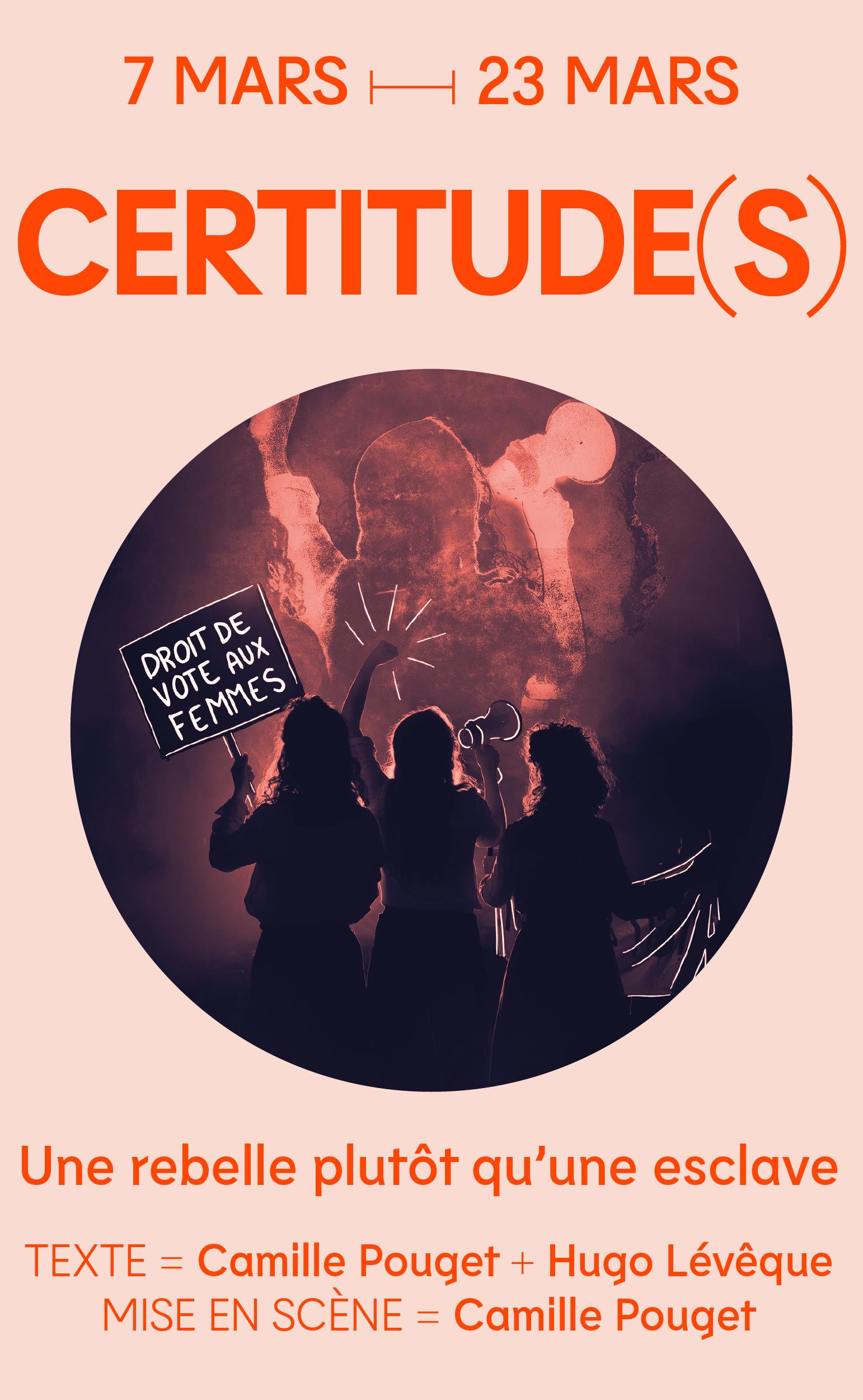 Jusqu’où sommes-nous prêt.e.s à aller pour défendre nos idées ? Quatre comédien.ne.s retracent, dans une esthétique contemporaine, l’histoire des suffragettes et de la lutte pour le droit de vote des femmes. Entre exaltation et violence, dans un dispositif bi-frontal, une fresque théâtrale et musicale où chacun.e lutte pour ce qui lui semble juste et interroge encore nos certitudes.