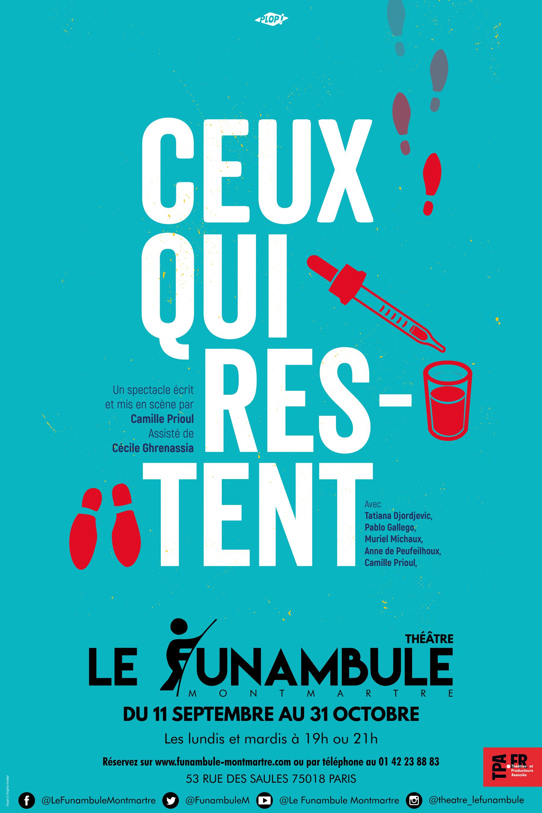 avant que de partir j'ai des choses à vous dire : j'aime le Funambule, j'en apprécie les programmations et je fais partie de ceux qui sont fidèles jusqu'au bout et ça tombe bien car je ferai partie toujours de ceux qui restent ! Anne de Peufeilhoux que j'apprécie pour l'avoir vu su dans un précédent spectacle, intelligent et drôle (seule en scène) est ici dans un registre qui pourrait vous prendre à la gorge (un p'tit nougat pour faire glisser) si l'écriture intelligente n'avait pas évité le pathos en nous maintenant en équilibre entre le rire et les larmes. La comédienne est magnifiquement assistée par de jeunes et talentueux partenaires, naturels et ô combien justes et crédibles. Ne craignez pas le sujet la peur n'évite pas...vous savez bien mais ici vous aimerez la vie à en crever, vous vous direz que la vie c'est une sacrée addition : celles de moments heureux dont il faut soustraire les drames et les peines. Vous penserez aux autres plus qu'à vous même avec pour seule boussole le bien être et la volonté de cet autre pour ne pas vous briser sur l'île du pathos. Là-bas toutes les sirènes vous chanteront les chants funèbres (c'est dans la brochure du programme!). Ne ratez pas "ceux qui restent", ils(les comédiens) ont besoin de vous et les pièces de qualité sont une excellente médecine. Bravo à tous et merci au Funambule!.