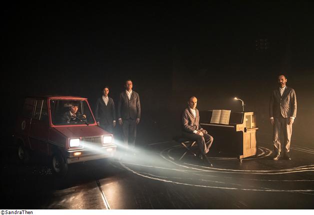 La nuit, dans une forêt obscure, une voiture sort de la route après avoir heurté une biche. Des mélodies romantiques sortent de la radio de l’épave encore fumante. Morceaux par morceaux, les cinq comédiens-musiciens reconstituent minutieusement l’accident. Au fil du spectacle, des clés sont données et les éléments du crash se mettent en place. L’audacieux Zurichois Thom Luz construit un paysage théâtral tout en décalages, entre l’absurdité drôlatique du cinéma de Tati et l’inquiétante étrangeté des films de David Lynch. Dans cet univers indécis, le son vient distordre la perception du temps. On entend principalement les romances pour piano du célèbre compositeur romantique Mendelssohn – Chansons sans paroles – arrangées pour cordes, piano électriques et percussions sur objets, par le musicien Mathias Weibel. Les interprètes nous entraînent dans une aventure mystérieuse dont chaque détail fait figure d’indice. Comme dans When I die - a Ghost Story with Music, présenté au Nouveau théâtre de Montreuil en 2018, Thom Luz propose de s’ouvrir à l’inhabituel pour s’immerger dans une expérience de perception aiguë.