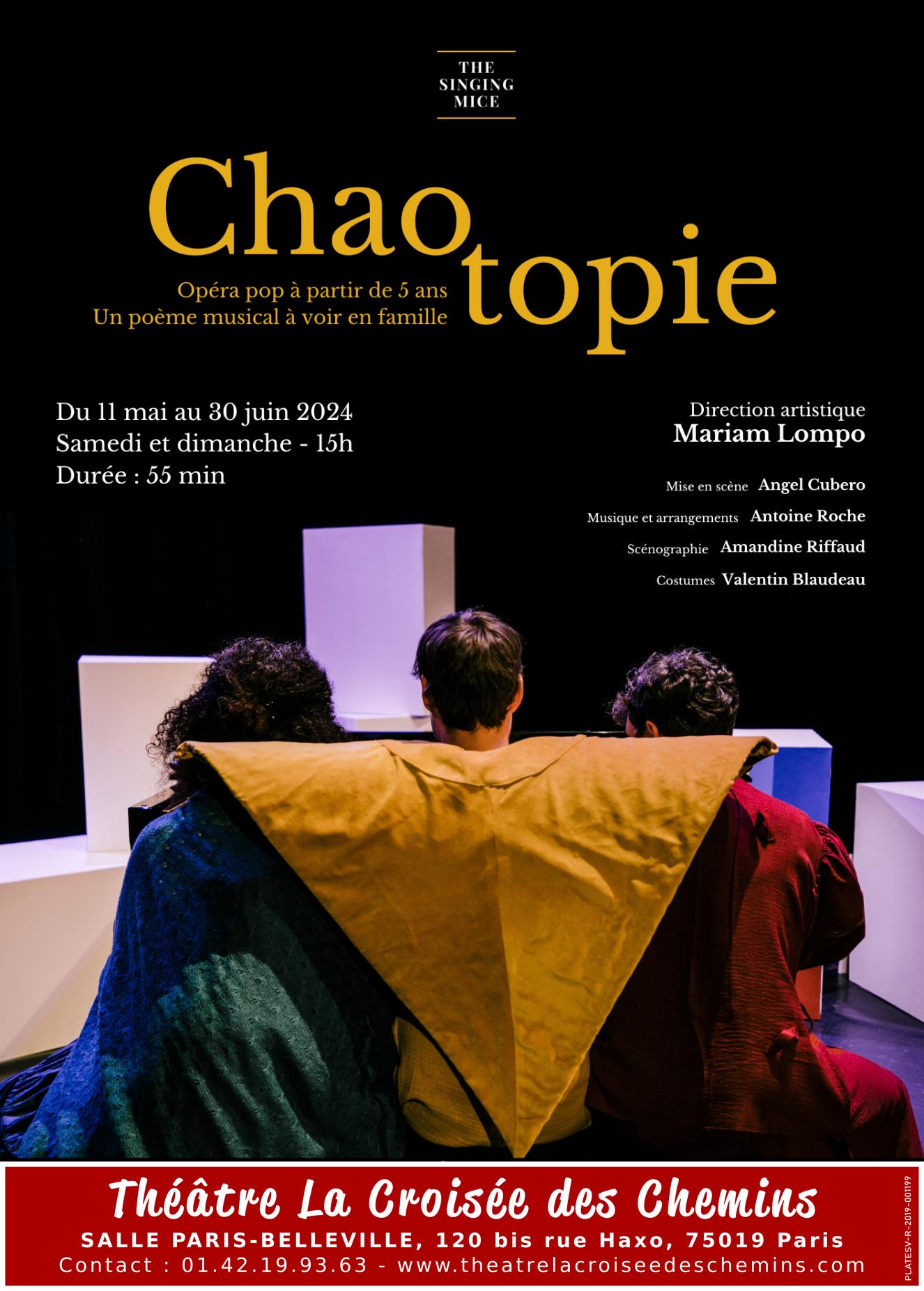 À travers le chant, le piano et la danse, la Cie The Singing Mice propose un voyage musical à travers la musique classique, la pop et le blues. Fidèle à sa recherche de cross-over entre les genres musicaux, la Cie propose avec Chaotopie une exploration joyeuse et burlesque du vivre ensemble et de l'acceptation des différences. La scénographie et les costumes colorés raviront les plus jeunes, tandis que les arrangements et la puissance des voix séduiront les plus expérimentés.