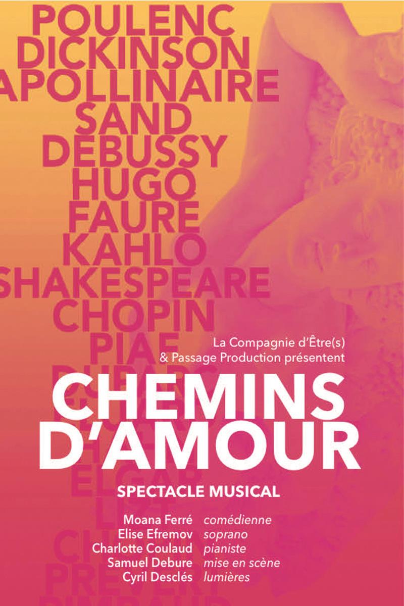 Trois femmes, une comédienne, une soprano et une pianiste, vous entraînent sur les Chemins d’Amour. Dans une mise en scène épurée, enlaçant textes et mélodies, elles partagent les tumultes de la passion, rêvent et se confient