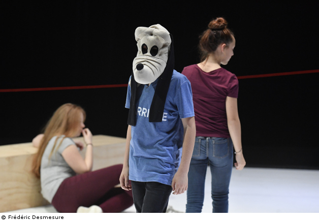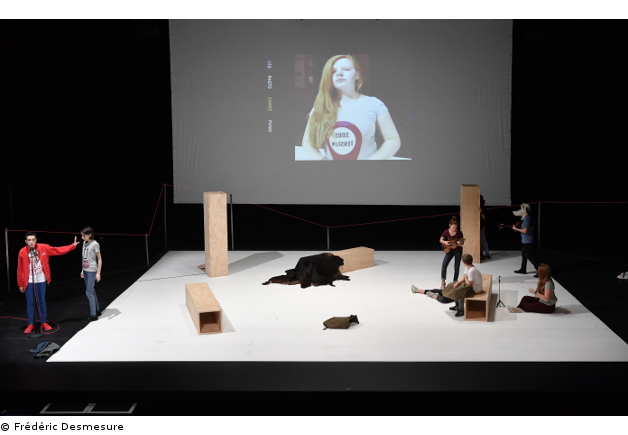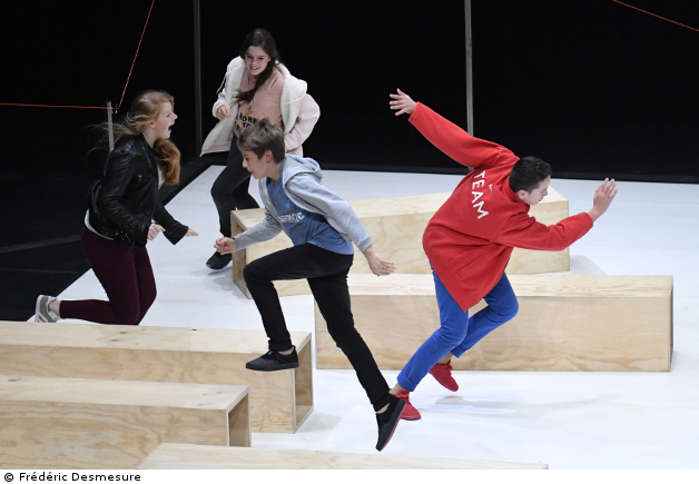 Armé·e·s d'un simple micro, ils et elles chantent, jouent, chuchotent sur le plateau habillé de cubes de bois. Ils avaient 13 ou 14 ans au moment de la création de la pièce, ils en ont à ce jour 17 ou 18. Comment regardent-ils le monde aujourd'hui, leur vie et nous, les adultes ? Comment ont-ils grandi, se sont-ils engagés ? Ils sont rompus à la prise de parole, leurs mots toujours justes traversent l'époque et disent le chemin parcouru. Et le défi reste le même : apprendre à cheminer enfin côté à côté et faire bloc.
