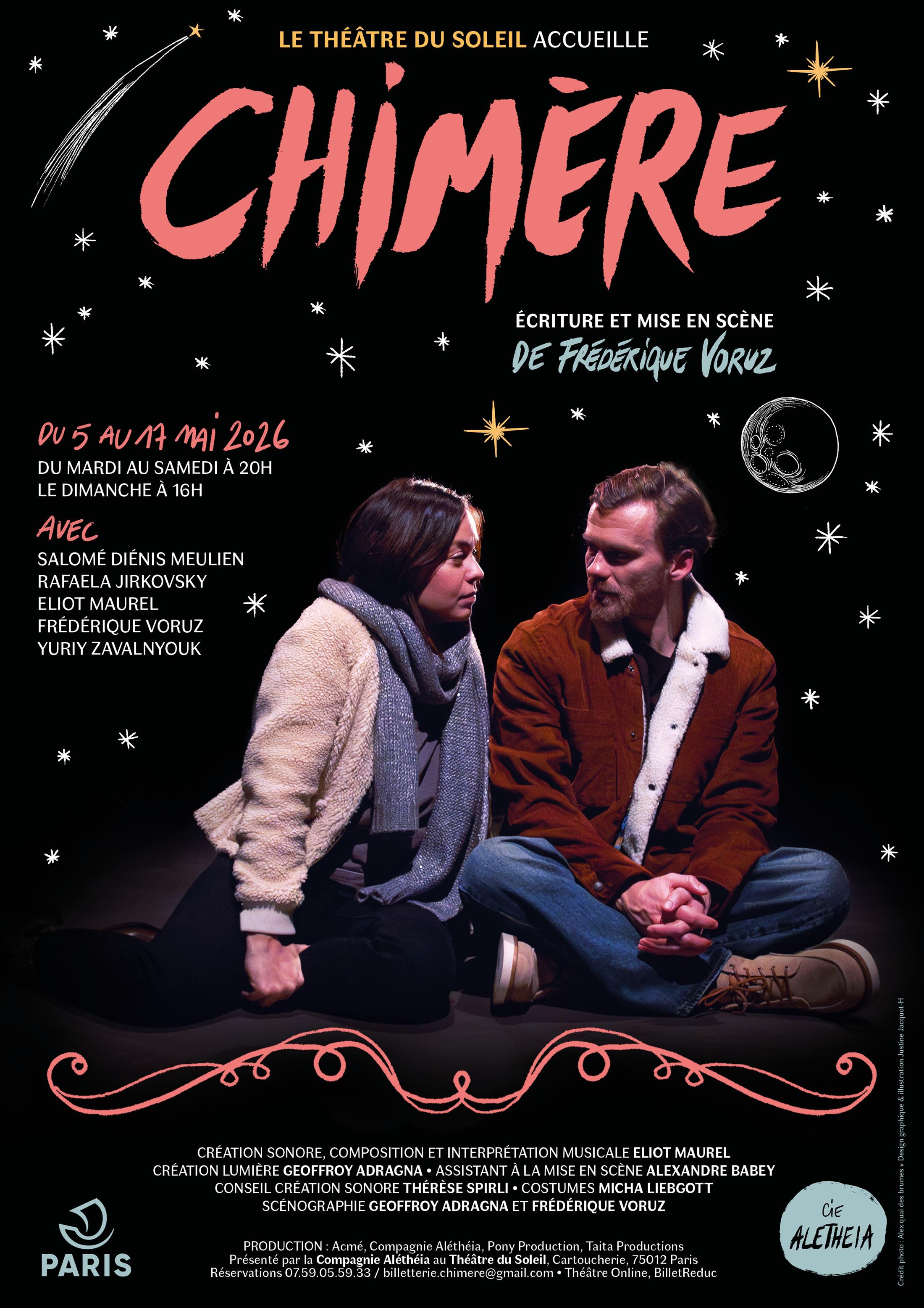 Et la Terre, comment elle a été créée la Terre ? Est-ce que ce ne serait pas de la science-fiction de pouvoir fabriquer un bébé ? Davantage qu’un spectacle sur la PMA, Chimère est une épopée intime sur la création de la vie. C’est un conte saupoudré d’humour noir, moderne et universel.