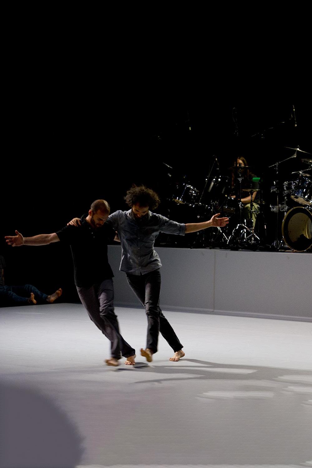 Au plateau, huit danseurs évoluent au son percutant des deux batteurs envoyant rythmiques tribales et sonorités rock psychédéliques. Au total donc, dix hommes réunis autour d’une même question : comment faire groupe ?