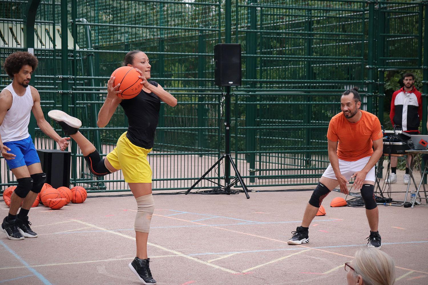 La pièce démarre comme un match de basket. Le ballon est au centre du jeu puis disparaît progressivement au profit des corps des danseurs : le ballet terrain devient ballet aérien, corps, ballon, arbitre, DJ, le tout sur des sons électro métissés de bruits de match et de ballon. C’est ce qu’elle appelle le transvasement des énergies et c’est irrésistible.